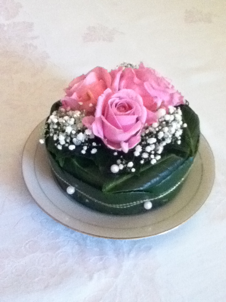 Vervolgens werden we aan het werk gezet. We hadden de opdracht gekregen een scherp mesje mee te brengen en omdat we vreedzame gedachten hebben, vermoedden we dat het iets met een stukje te maken zou hebben, maar wat …? Het bleek dat we, na een uitgebreide instructie, een bloementaart gingen maken. Alles was goed voorbereid door de dames van de bloemengroep en er stonden emmers klaar met de prachtigste rozen, gipskruid etc.