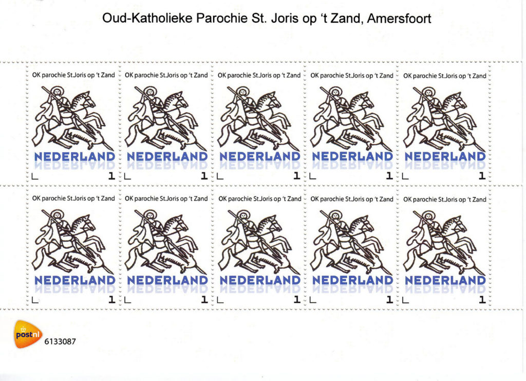 Via de website Postnl.nl heeft het Kerkbestuur zelfklevende postzegels aangemaakt met het logo van St. Joris op ’t Zand en de tekst OK Parochie St. Joris op ’t Zand in velletjes van 10. Eigenlijk waren de postzegels bedoeld voor eigen gebruik, maar al snel waren er mensen die graag een velletje van10 stuks wilden kopen. De frankeerwaarde van de postzegels met waardecijfer 1 is momenteel 10 x € 0,64 = € 6,40. Er zijn echter ook aanmaakkosten en het zou toch leuk zijn als de penningmeester er ook iets aan overhoudt. Daarom is de prijs vastgesteld op €10 per velletje met tien zegels. U steunt er de parochie mee en u heeft een leuk aandenken. Voor de postzegelverzamelaars onder ons een must-have.